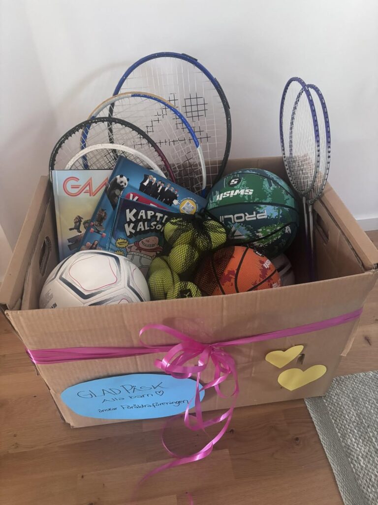 En låda fylld med fotbollar, basketbollar, tennisbollar, tennis- och badmintonracketar samt lite böcker som barnen önskat levererades idag till skolan från Föräldraföreningen